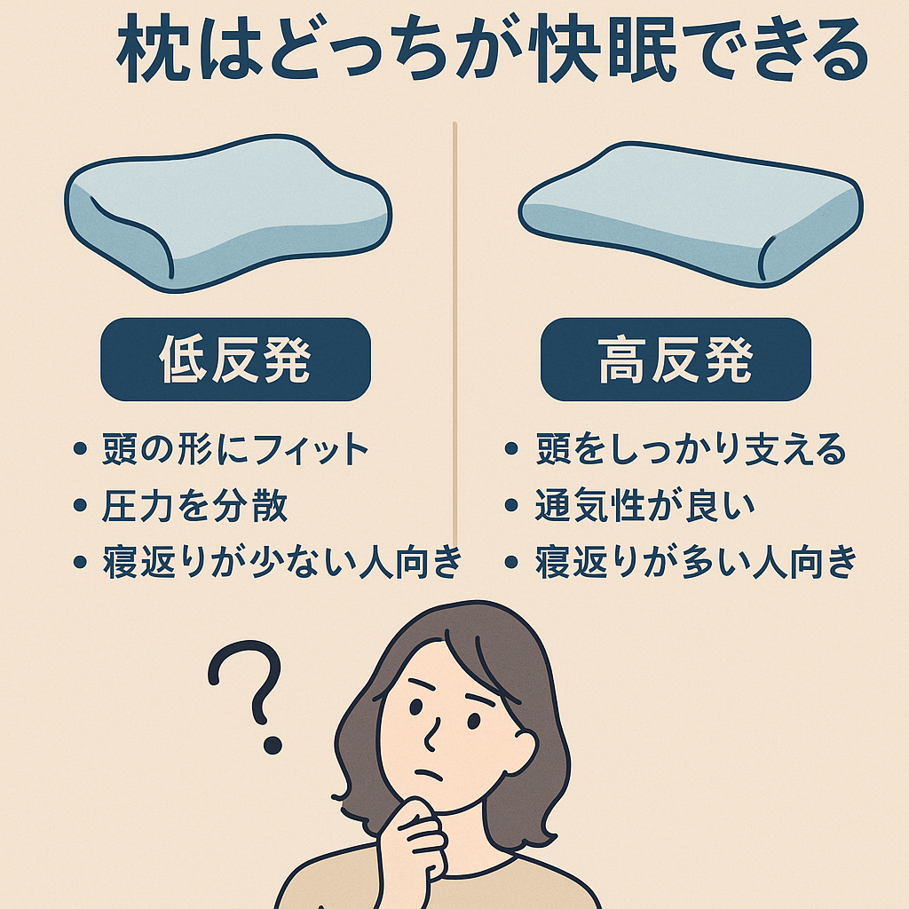 「枕が合わなくて首が痛い」「どの枕を選べばいいのかわからない」──そんな悩みを持つ人は多いです。特に人気なのが 低反発枕 と 高反発枕。どちらも快眠に効果があるといわれますが、それぞれに特徴があります。この記事では両者を比較し、自分に合った枕の選び方を紹介します。