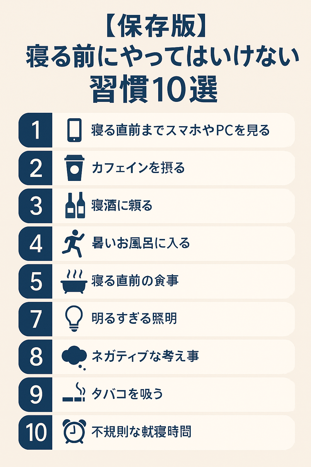 「布団に入っても眠れない」「寝ても疲れが取れない」──その原因は、実は 寝る前の習慣 にあるかもしれません。何気なくやっている行動が睡眠の質を大きく下げてしまうことがあります。ここでは、快眠を妨げるNG習慣を10個紹介します。