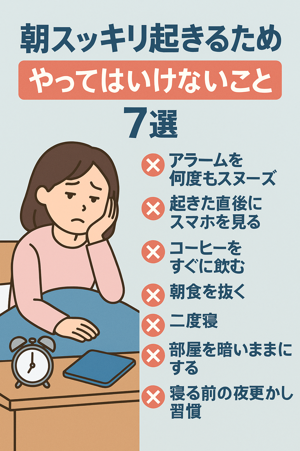 実は、朝スッキリ起きられない原因は 寝る前や起きた直後の習慣 に隠れていることが多いです。ここでは、朝の目覚めを悪くする“やってはいけないこと”を7つ紹介します。